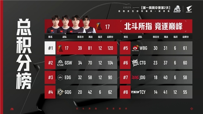 首日赛后,GSW凭借着59的总积分暂居第一,随后是17战队和PeRo战队,战神榜第一名则是给到了PeRo战队的Aixleft。