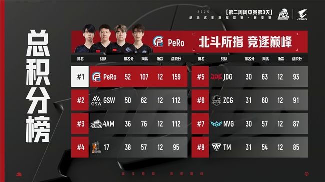 接下来的几场中,PeRo开始持续发力,不仅有吃鸡成功,在后续几场中也基本上都在TOP4中,最终让他们在本日的排名冲进了前4。