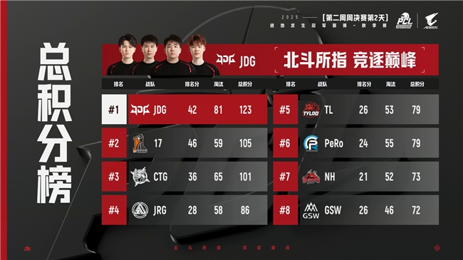 在9月14日 的第二阶段积分结算时,表现出色的JDG以123分稳稳占住榜首,随后是17占队和CTG,而来自JDG战队的SuZe则是获得了本轮的战神榜第一名。